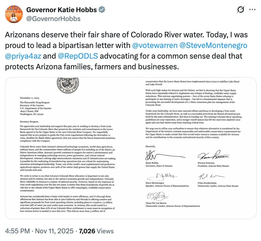 Hobbs and other Arizona leaders have been hammering the line that the upper basin states are refusing to accept necessary cuts, effectively holding the lower basin hostage and forcing the bulk of the reduction downstream, even as we’ve faced repeated cuts already.