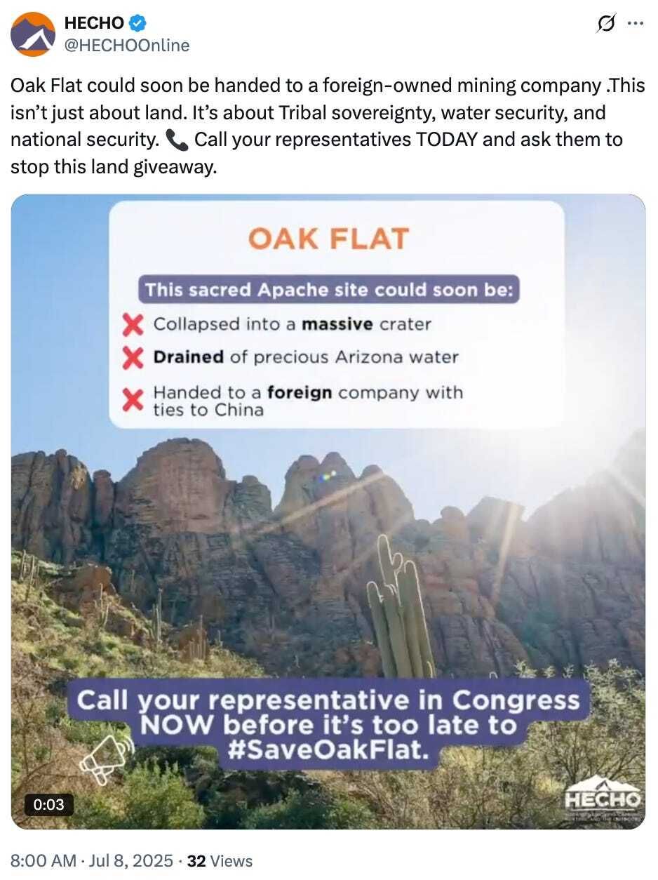 Mine-to-urban: Barring a successful appeal, the federal government is set to transfer public land at Oak Flat to Resolution Copper in August. Not only does the project threaten land sacred to the San Carlos Apache tribe — it may also lead to a conflict with residential development in the area, writes historian Joel Helfrich in an opinion piece for the Arizona Republic.