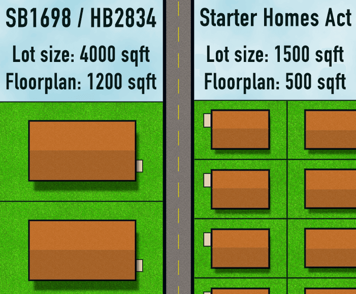 Both bills prohibit cities from rejecting high-density housing projects, but the Starter Homes Act nearly triples the density.