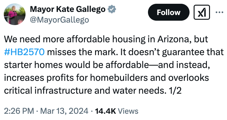 “AZ Cities is proud to champion new legislation that ensures Arizona residents – not Wall Street investors – have the first opportunity to buy starter homes in the state,” states a League of Arizona Cities and Towns press release.
