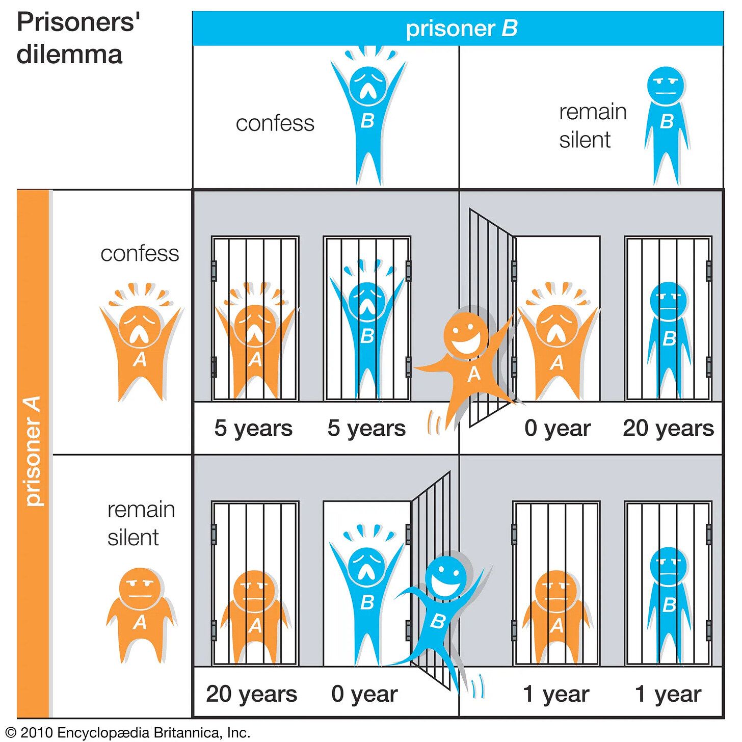 It’s a televised version of the famous “Prisoner’s Dilemma” scenario — if two suspected partners-in-crime both remain silent under interrogation, they can both avoid jail time. If one rats the other out, they get a light sentence, but the other gets a heavy sentence. If they both rat each other out, they both get moderate sentences.