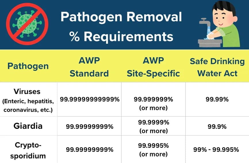 One question I had was why these requirements are structured as reduction percentages rather than concentration measurements. A main reason is that concentrations are so low after being purified to these extreme standards that it’s nearly impossible to detect pathogens and chemicals at all.