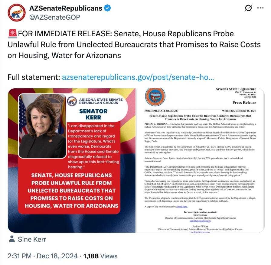 What they dubbed the “33.3% groundwater tax” was a “blatant overreach of executive authority,” as well as an “attack on hardworking Arizona families” who would watch housing prices jump by thousands of dollars.